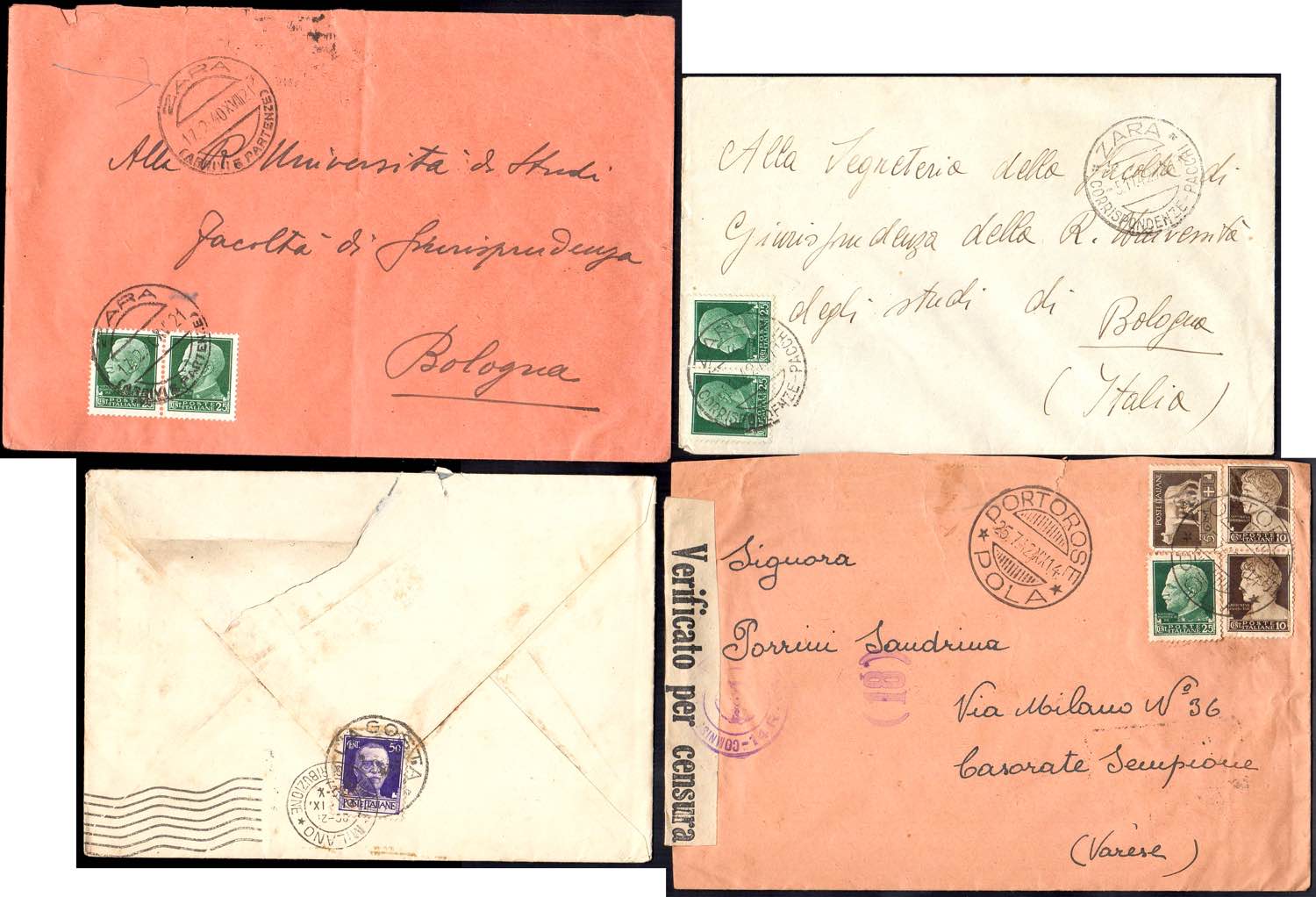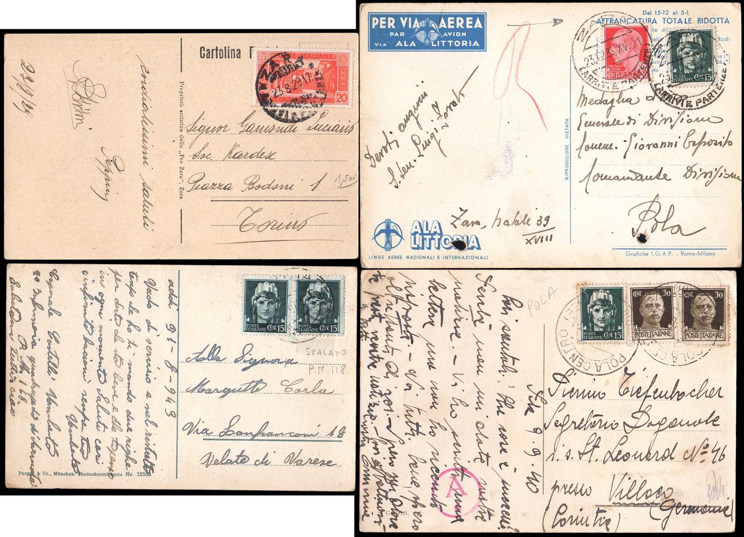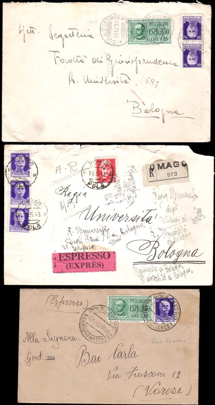 OCCUPAZIONE ITALIANA ISTRIA E DALMAZIA 1924/1942 - Lotto di trentatre lettere/cartoline viaggiate, partite da Zara, Spalato, Pola e altre località limitrofe. Interessante e non comune insieme.