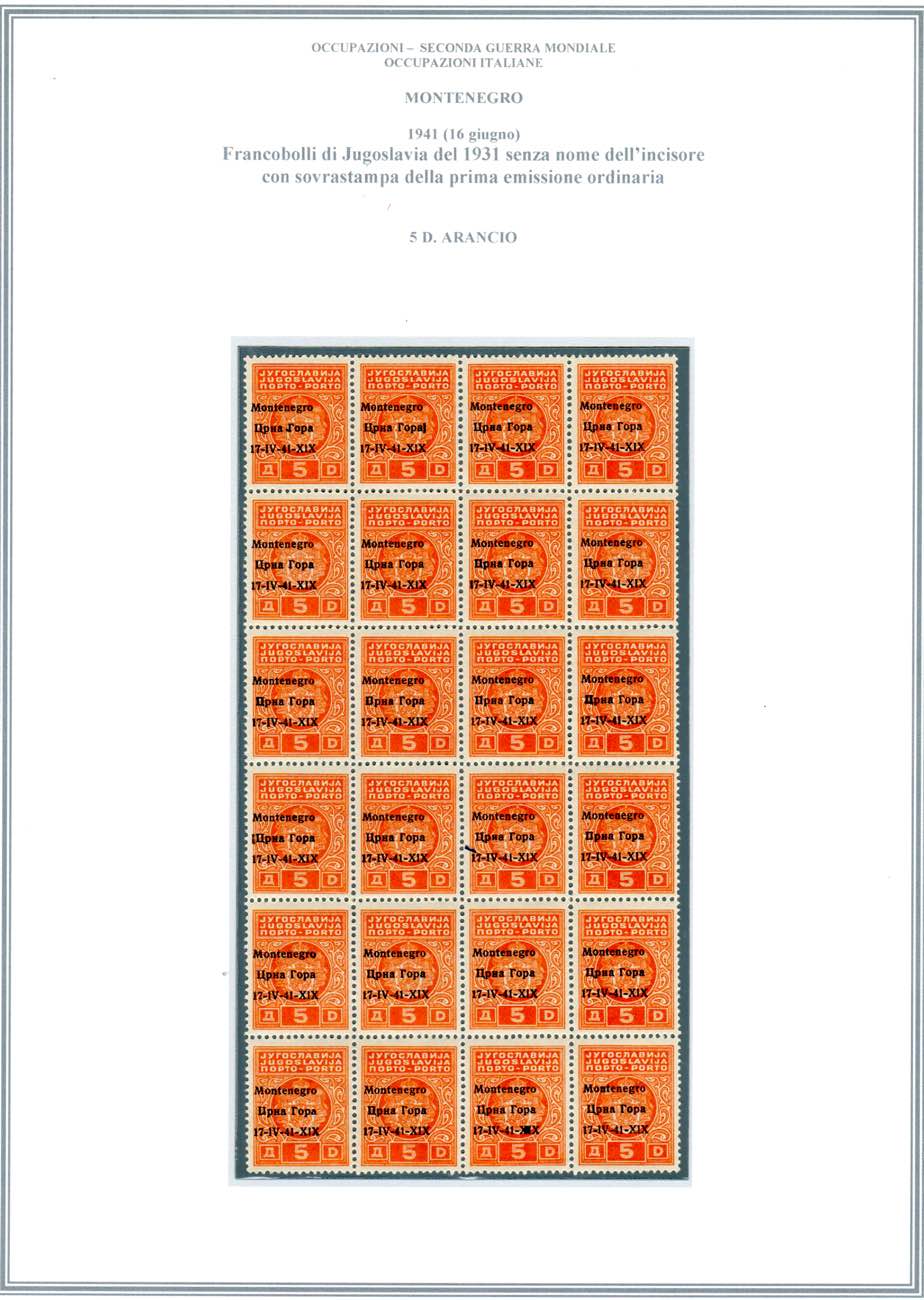OCCUPAZIONE ITALIANA MONTENEGRO SEGNATASSE 1941 - 5 d. soprastampato, soprastampa spostata a sinistra, varietà non catalogata (4), blocco di 24 esemplari, gomma integra, perfetto.