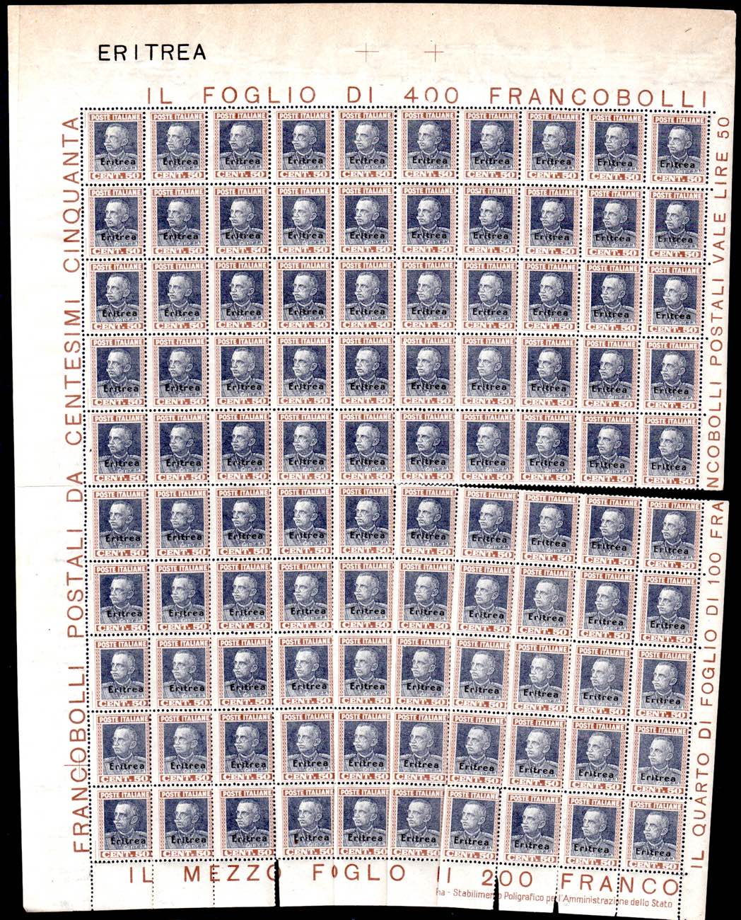 COLONIE ITALIANE ERITREA 1928 - 50 cent. Parmeggiani soprastampato (128), foglio completo di 100 esemplari, aperto in due punti, gomma integra, perfetto. Raro.