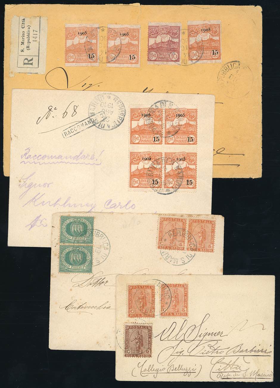 SAN MARINO 1902/1905 - Quattro buste, tra cui due raccomandate, con interessanti e non comuni affrancature del periodo.