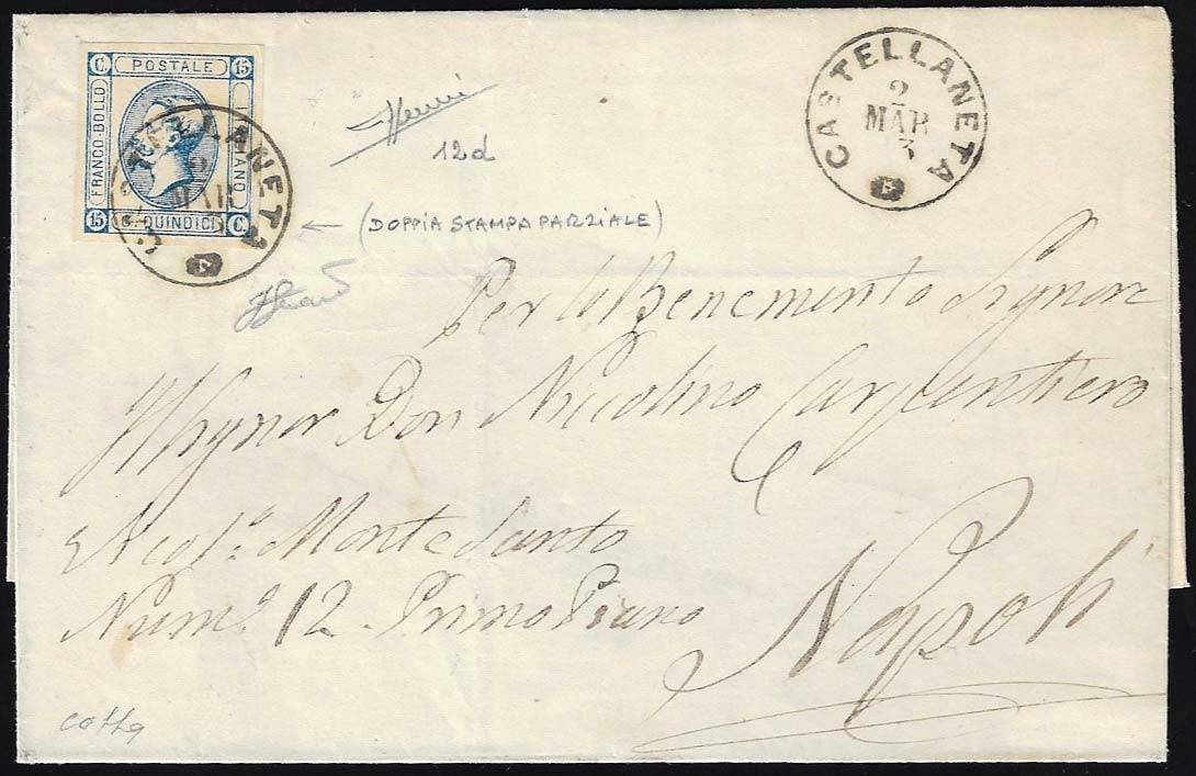 1863 - 15 cent. Litografico, I tipo, doppia stampa parziale in basso e a destra (12d), perfetto, su sovracoperta di lettera da Castellaneta 2/3/1863 a Napoli. Molto rara! Ferrario, cert. Colla e Sorani.