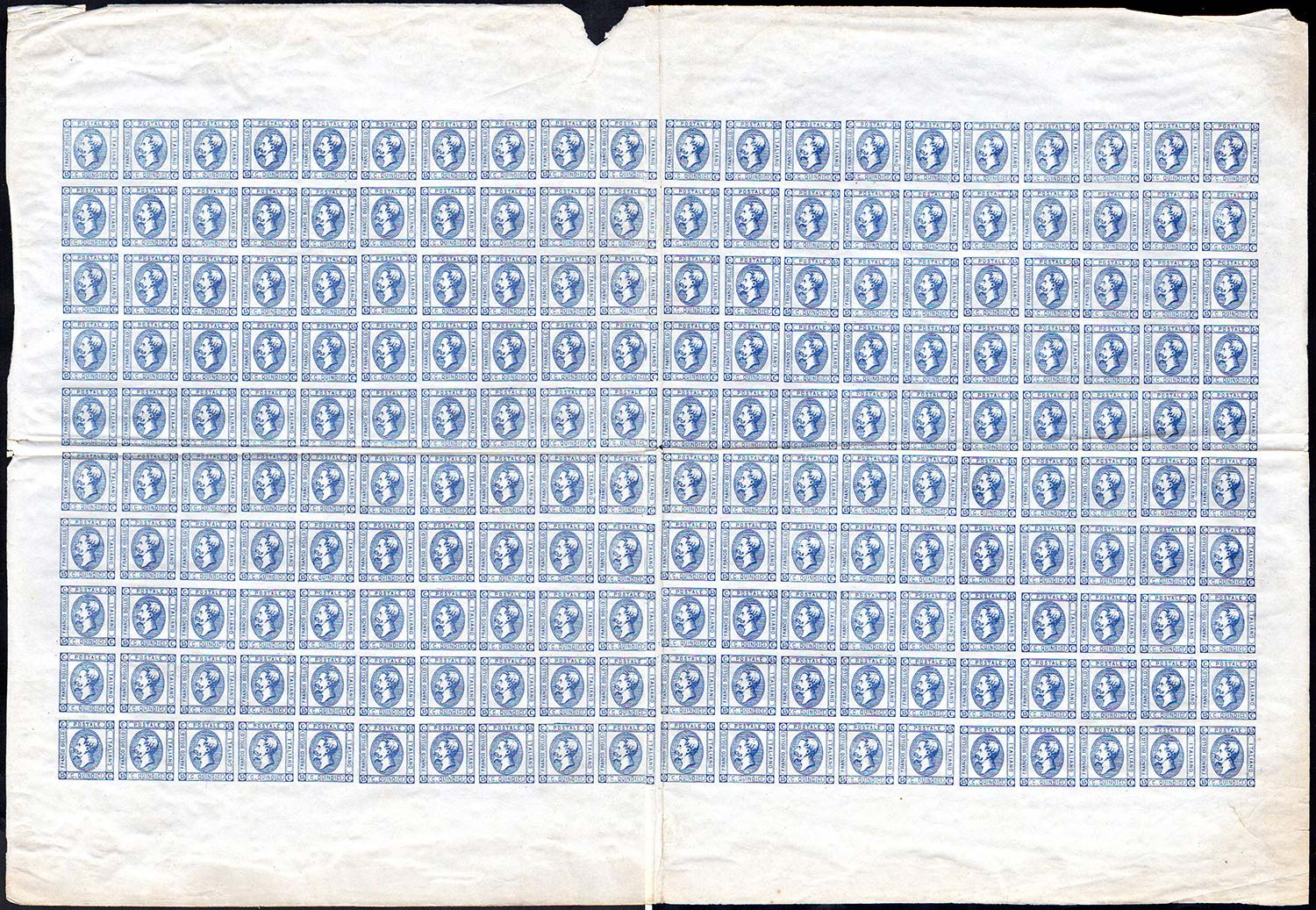 1863 - 15 cent. Litografico, II tipo (13), foglio completo di 200 esemplari, mostrante gli interspazi di gruppo, gomma integra e in ottimo stato. Molto raro.
