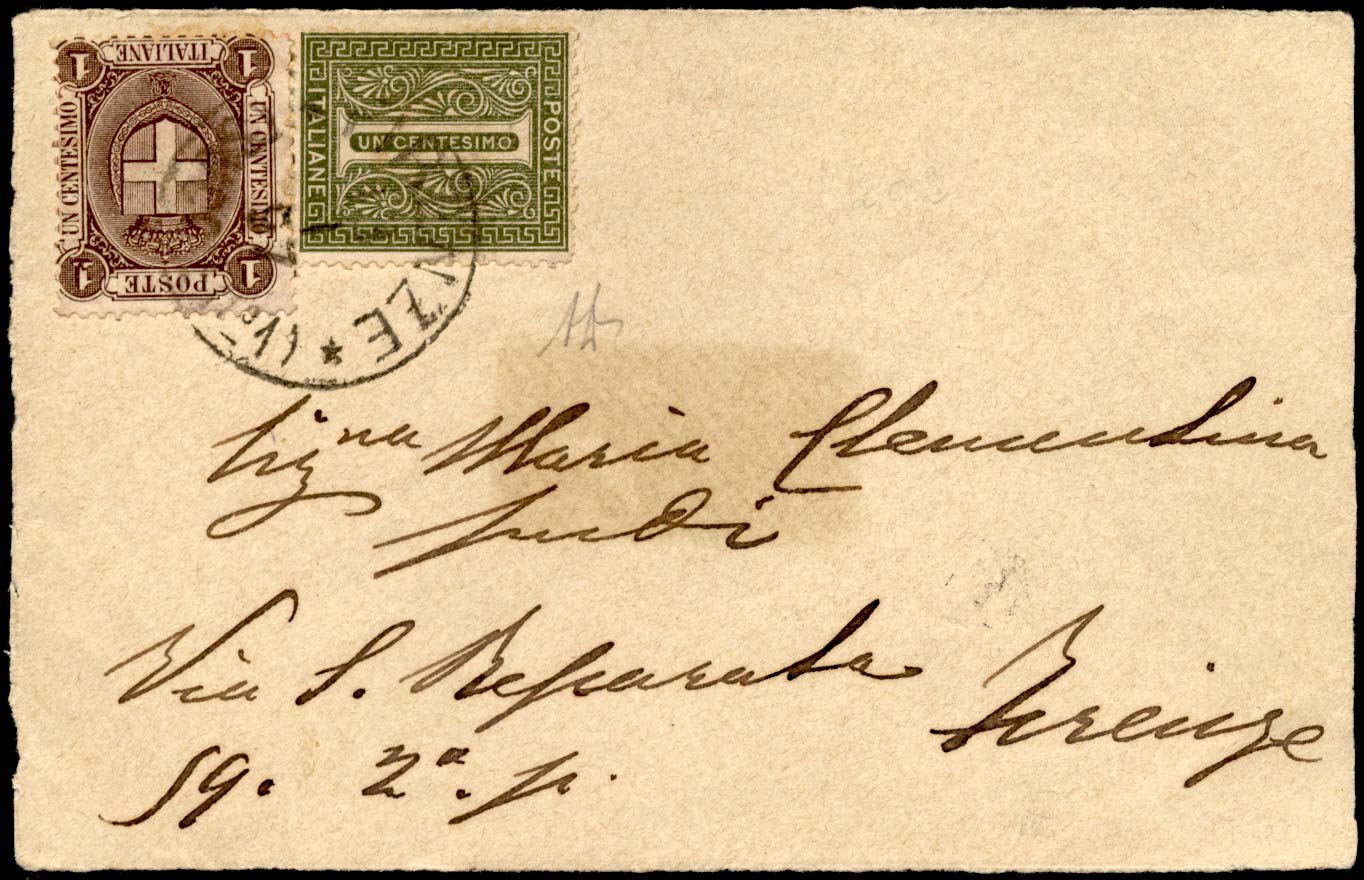 1901 - 1 cent. De La Rue, tiratura di Torino (T14) e 1 cent. Umberto (65), perfetti, su frontespizio di lettera da Firenze 25/1/1901 per ... Leggi tutto