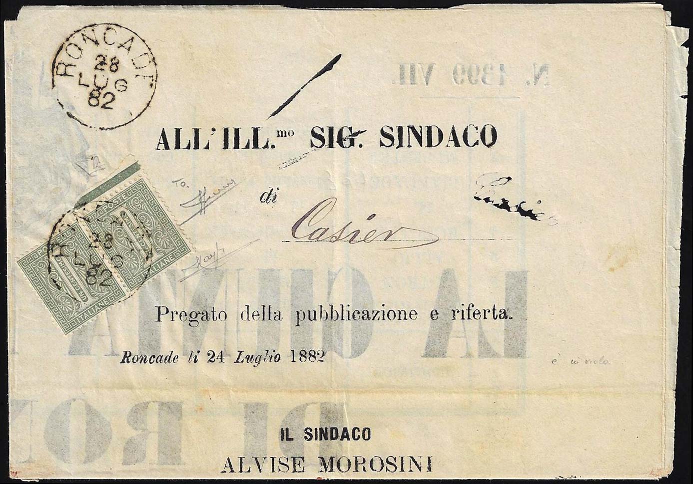 1882 - 1 cent. De La Rue, tiratura di Torino, bordo di foglio in alto con linea di colore (T14gd), in coppia con il normale, su manifesto da Roncade 28/7/1882. Raro. Sorani, Raybaudi, cert. E.Diena.