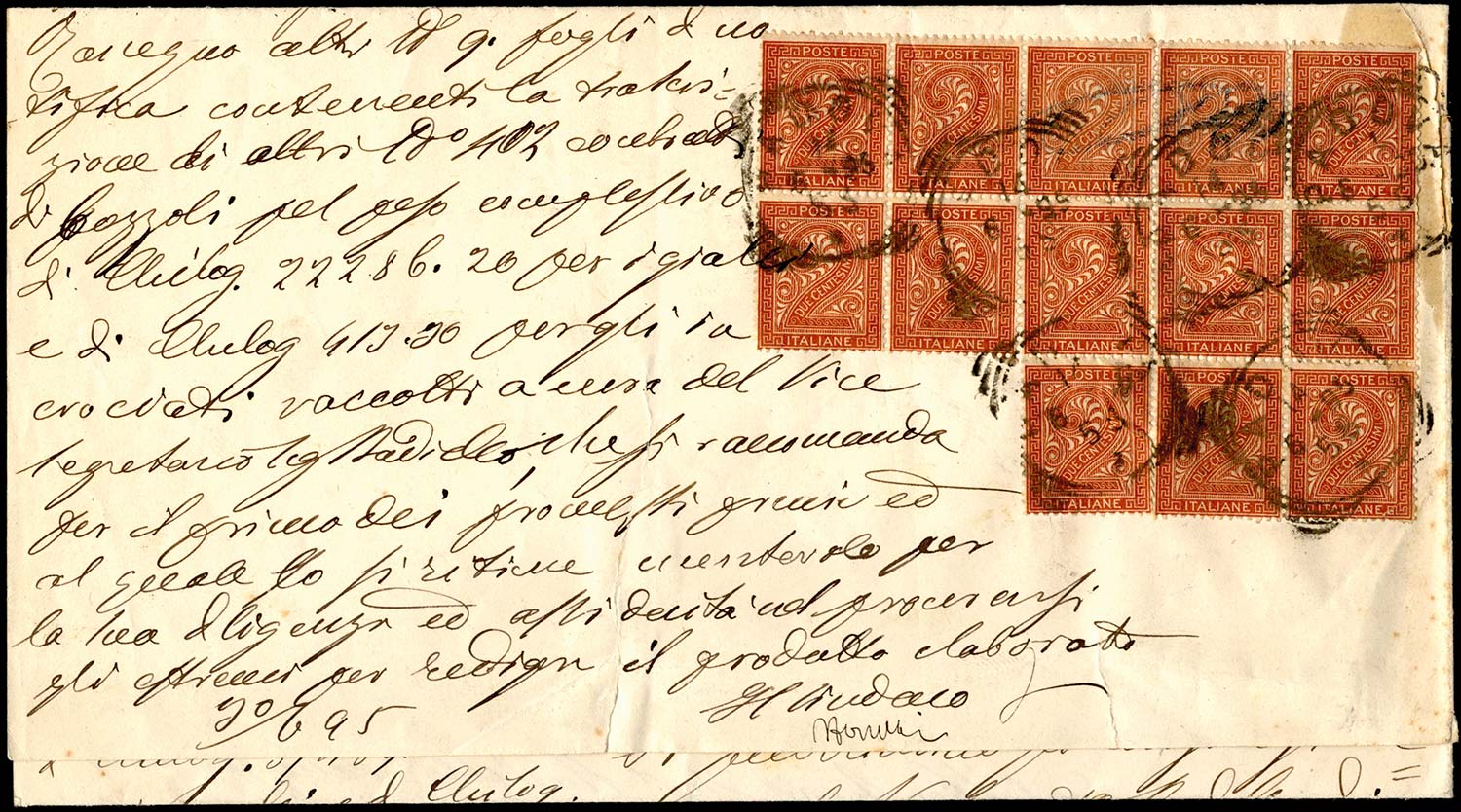 1895 - 2 cent. De La Rue, tiratura di Torino (T15), blocco di 13 esemplari, ottimo stato su invio sotto fascia da Padova 14/6/1895. Bella ... Leggi tutto