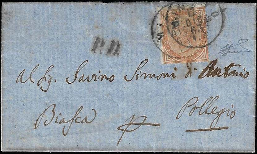 1863 - 10 cent. De La Rue, tiratura di Londra (L17), tagliato con le forbici, isolato su lettera da Milano 12/12/1863 a Biasca, in ... Leggi tutto