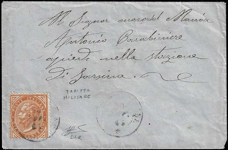 1865 - 10 cent. De La Rue, tiratura di Londra (L17), perfetto, isolato su bustina diretta a militare, in tariffa ridotta, per Sarsina 2/12/1865. Interessante in quanto diretta ad un carabiniere. Ferrario.