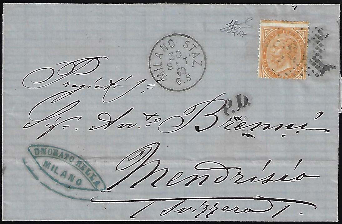 1869 - 10 cent. De La Rue, tiratura di Torino, dentellatura fortemente spostata (T17g), perfetto, su fresca lettera da Milano 30/9/1869 a Mendrisio in Svizzera, in tariffa di raggio limitrofo. Molto bella ed impreziosita dalla varietà. Ferrario.
