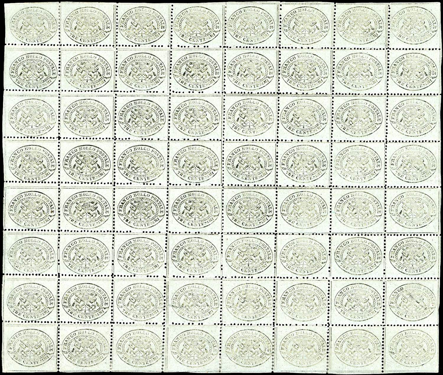 1867 - 3 centesimi grigio chiaro (24), foglio completo di 64 esemplari, gomma originale, integra per 49 esemplari, perfetto. A.Diena, G.Oliva, Chiavarello. Ex coll. Imperato.