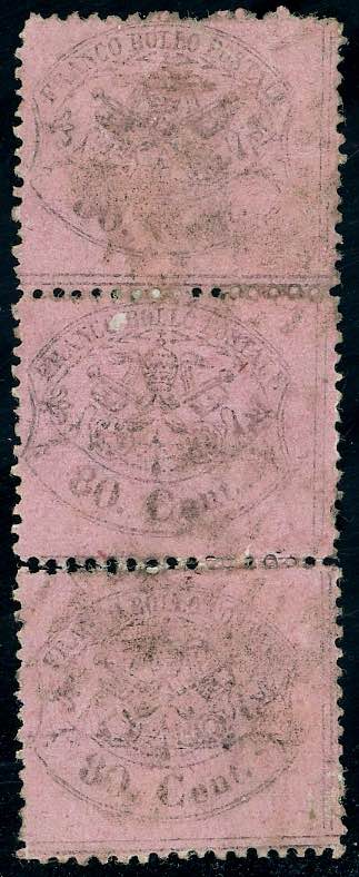 1868 - 80 cent. rosa chiaro (30), striscia verticale di tre, usato, buono stato. A.Diena. Ex coll. Imperato.
