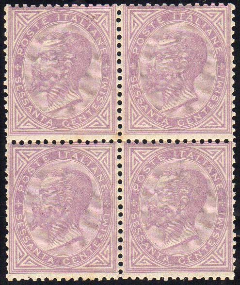 1863 - 60 cent. De La Rue, tiratura di Londra (L21), blocco di quattro perfetto, discreta/buona centratura, gomma originale integra. Bello ... Leggi tutto