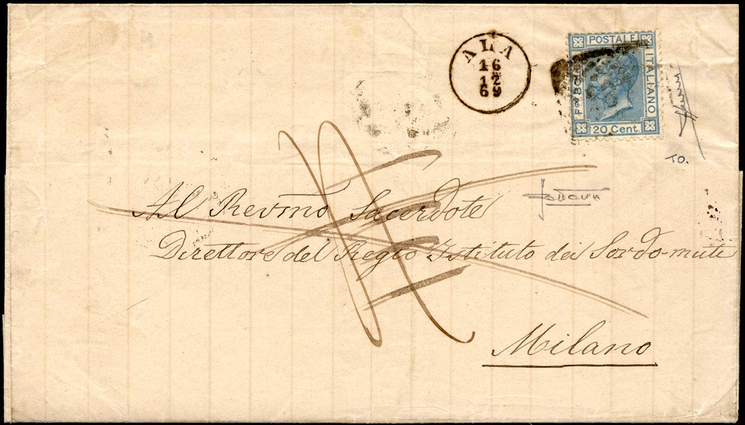 1869 - 20 cent. azzurro, tiratura di Torino (T26), difetti, su lettera da Ala 16/12/1869 a Milano, annullato in arrivo, tassata e ... Leggi tutto