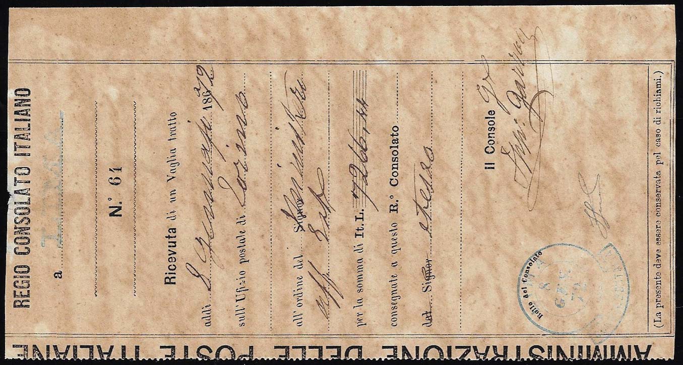 1872 - Ricevuta vaglia dal Regio Consolato Italiano di Lima 8/1/1872, doppio cerchio con bandella, a Torino. Molto raro. Ferrario.