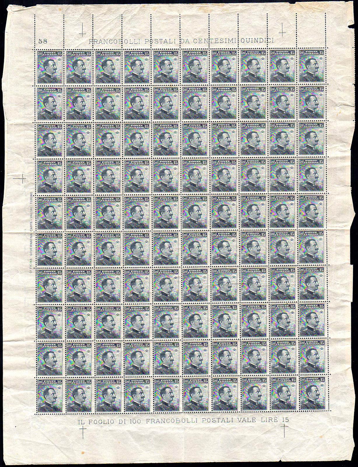 1911 - 15 cent. Michetti, III tipo (96), foglio completo di 100 esemplari, gomma integra, perfetto.