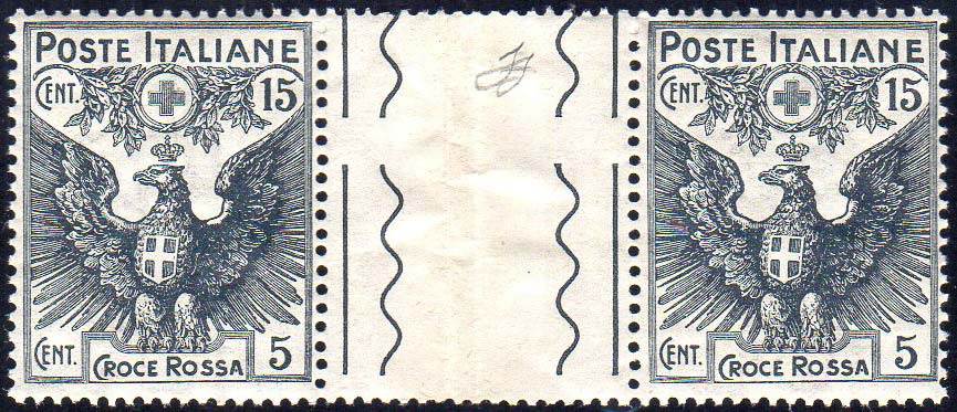 1915 - 15 + 5 cent. grigio, Pro Croce Rossa (103), coppia orizzontale con interspazio di gruppo al centro, nuova, gomma originale integra, ... Leggi tutto