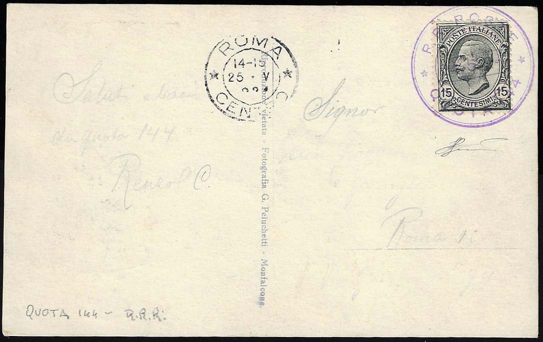 1922 - 15 cent. Leoni (108), angolo arrotondato, su cartolina con annullo R.R. Poste Quota 144 24/5/1922 a Roma, bollo di arrivo. Raro annullo! Ferrario.
