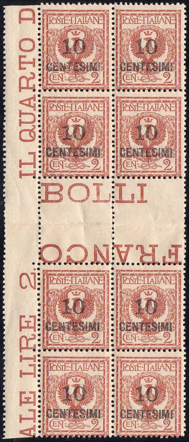 1923 - 10 cent. su 2 cent. Floreale (138), blocco di otto esemplari con interspazio verticale, perfetto, gomma originale integra. Bello e raro!