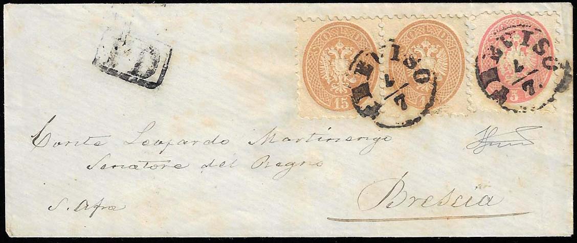 1866 - 15 soldi bruno, due esemplari, perfetti, 5 soldi rosa, un angolo arrotondato, tutti dent. 9 1/2 (45,43), su busta da Treviso 4/7/1866 a Brescia. Ferrario.