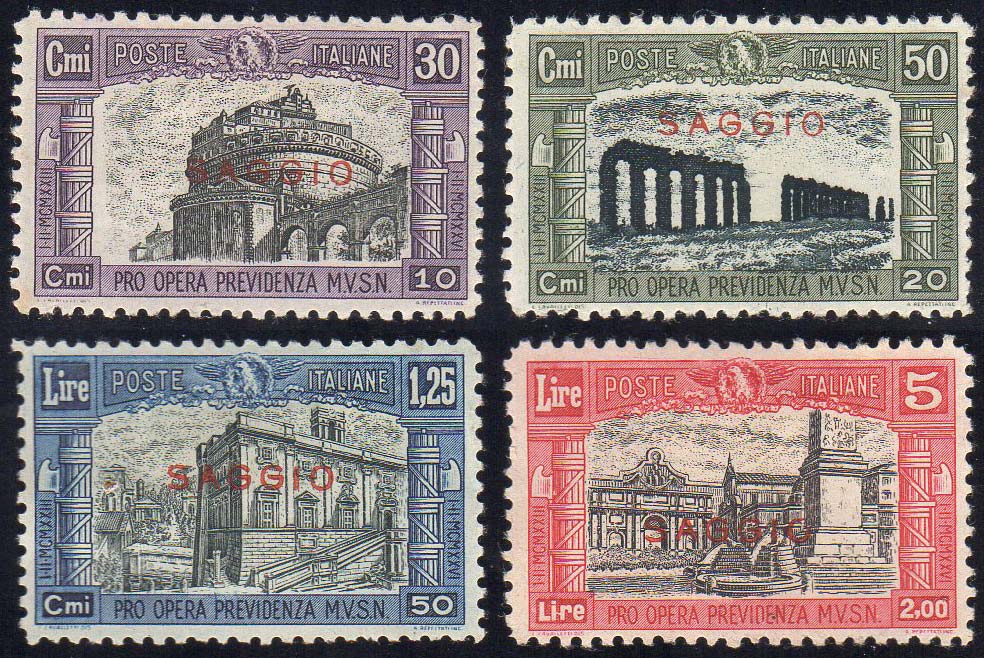 1928 - Milizia II, soprastampati "saggio" (220/223), senza gomma, perfetti.