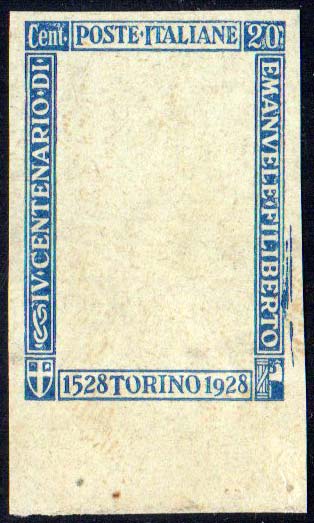 1928 - 20 cent. Emanuele Filiberto (226), prova di macchina della sola cornice in oltremare (colore poi adattato per la vignetta), bordo di ... Leggi tutto