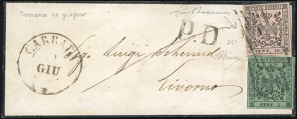 1855 - 10 cent. rosa, errore tipografico "N" coricata, 5 cent. verde oliva, entrambi con punto dopo le cifre (9i,8), perfetti, su piccola busta da Carrara 10/6/1855 a Livorno. Molto rara. A.Diena, cert. Vaccari.