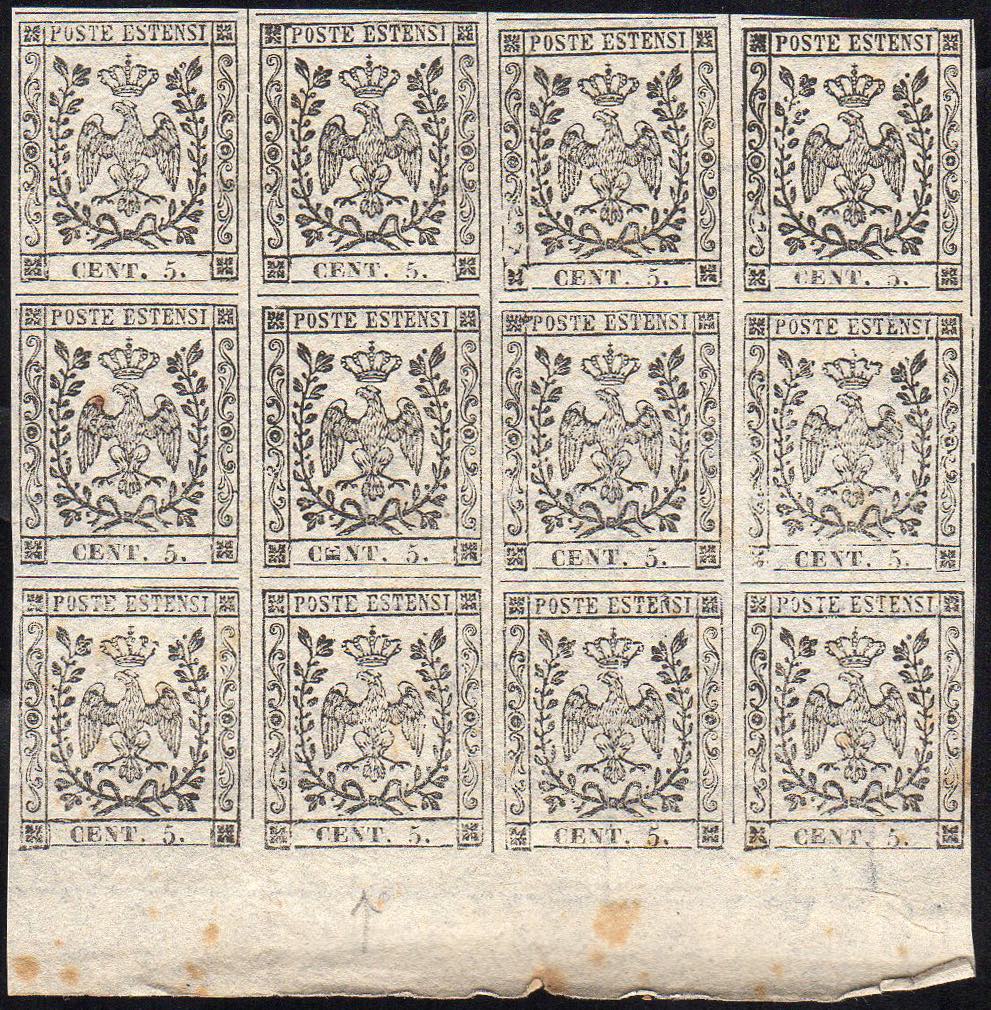 1852 - 5 cent. bianco, prova su carta bianca, filigrana A (P21 nota), blocco di dodici esemplari senza gomma, perfetto. Il sesto esemplare, posiz. 246 del foglio, varietà E coricata. Rarissimo insieme! Ferrario.