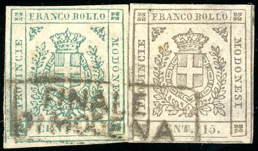 FINALE DI MODENA, cartella punti R1 - 5 cent., 15 cent. (12,13), perfetti, ricongiunti tramite linguella, usati. Raro annullo. Cert. Avi.