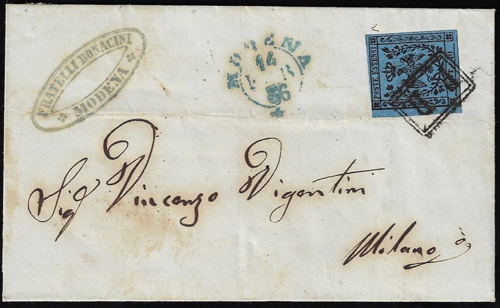 MODENA, PD + cerchio punti 8 - 40 cent. (10), perfetto, su sovracoperta di lettera del 14/2/1856 per Milano. Prima data nota per questa combinazione d'annulli.