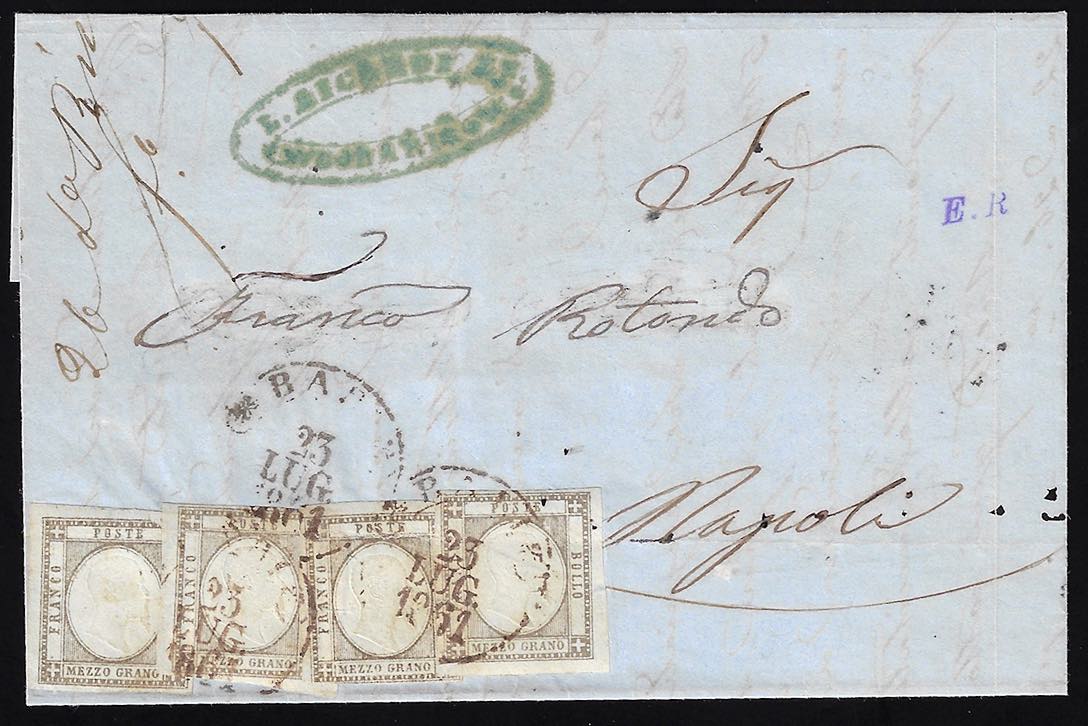 1861 - 1/2 grano grigio bruno (18a), quattro esemplari, lievi difetti, su lettera da Bari 23/7/1861, cerchio bruno (punti 8), a Napoli.