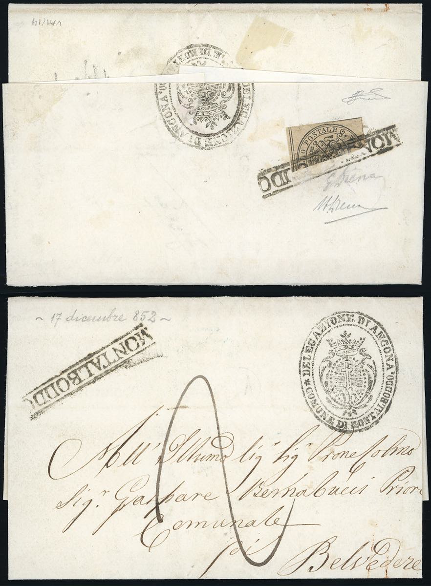 1852 - 4 baj bruno grigio chiaro (5), frazionato verticalmente a metà, al verso di sovracoperta di lettera in porto assegnato da Montolboddo 17/12/1852 a Belvedere, tassata 2 baj. Em. e A.Diena, Ferrario.