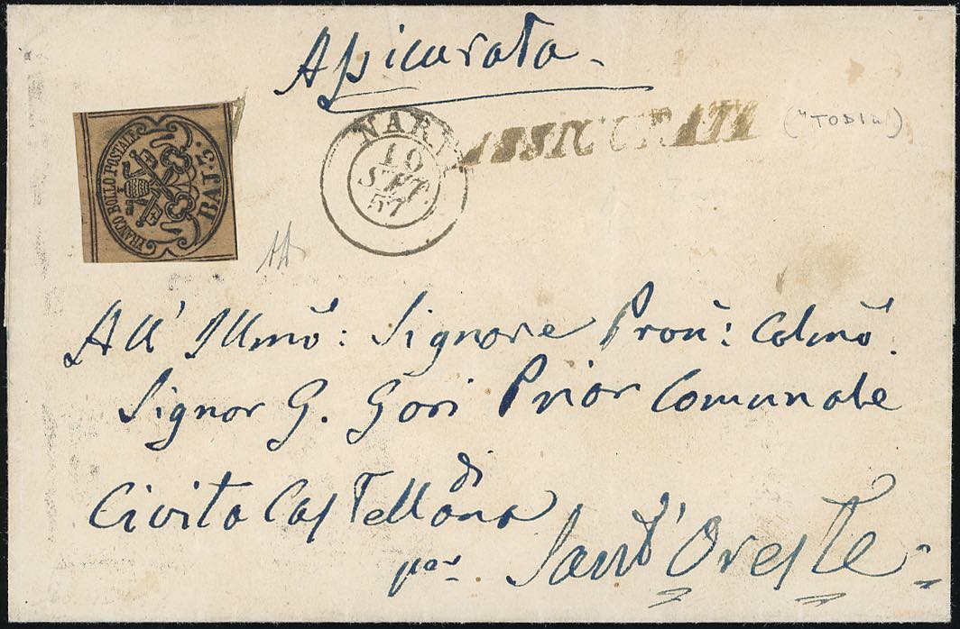 TODI ASSICURATA senza il bollo nominativo, punti 12 - 3 baj (4Ab), perfetto, su sovracoperta di lettera assicurata del 10/9/1857 per ... Leggi tutto
