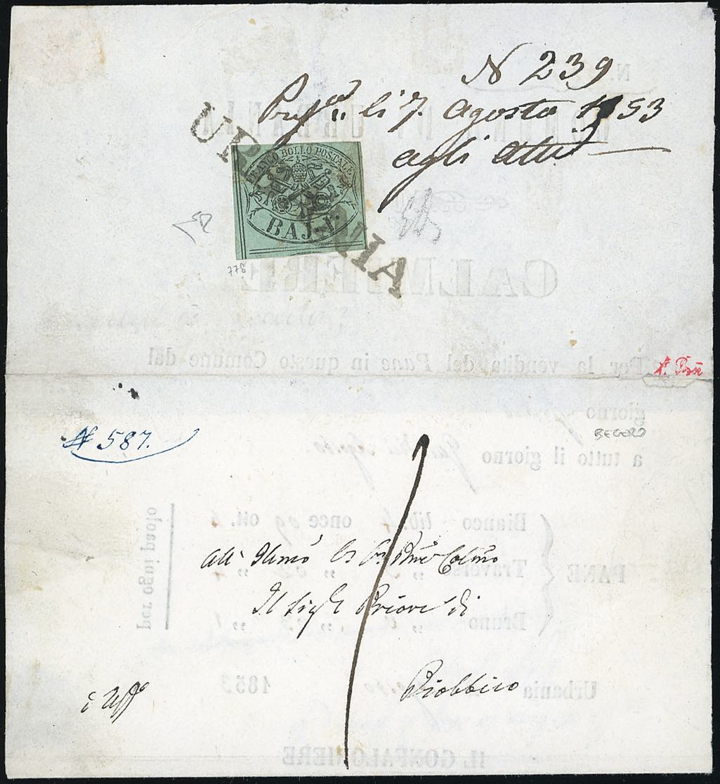 URBANIA, punti 13 - 1 baj (2), perfetto, al verso di lettera in porto assegnato del 2/8/1853 per Piobbico. Em.Diena, cert. E.Diena.