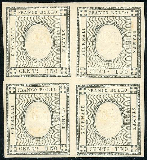 1861 - 1 cent. per stampati , errore di cifra, 2 al posto di 1 (19l), blocco di quattro, gomma originale, integra per i due esemplari inferiori, perfetto. Chiavarello, cert. Ferrario. Ex collez. Imperato.