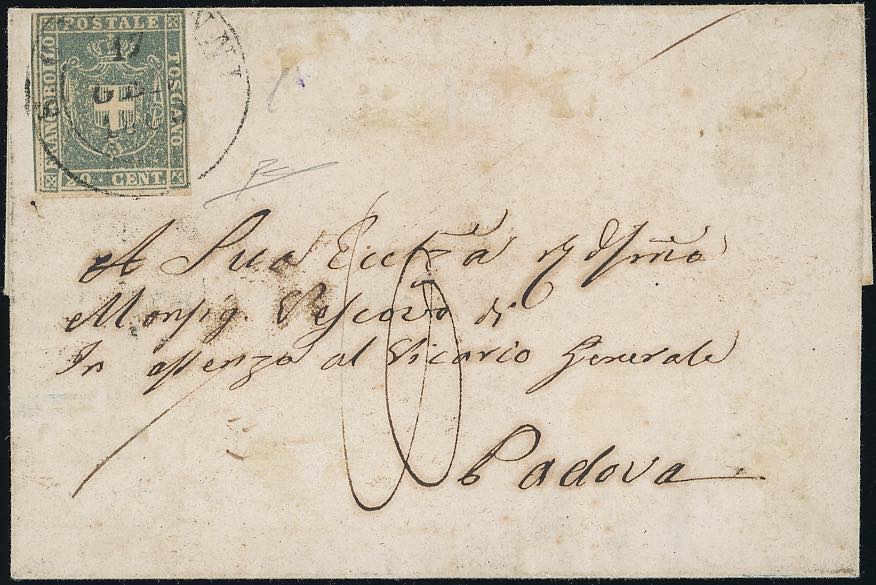 SAN GIOVANNI, doppio cerchio grande punti 5 - 20 cent. (20c), varietà cornice sinistra evanescente, su sovracoperta di lettera del 17/1/1860 per Padova, tassata 10 soldi. Interessante e raro insieme. R.Diena.