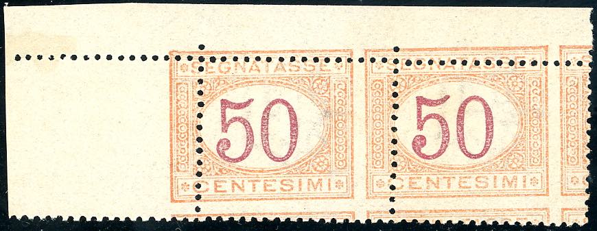 1890 - 50 cent. arancio e carminio (25), dentellatura fortemente spostata in basso e a destra, coppia orizzontale, angolo di foglio, gomma integra, perfetta. Bella varietà non catalogata. Cert. E.Diena.