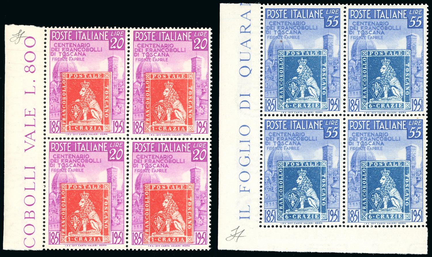 Lotto 1730 - 1951 - Toscana (653/654), blocchi di quattro, gomma ...