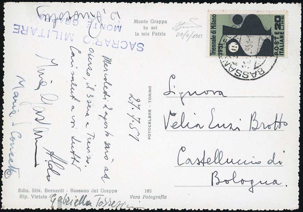 1951 - 20 lire Triennale (666), perfetto, isolato su cartolina da Bassano del Grappa 31/7/1951 a Castelluccio di Bologna. Pregevole uso ... Leggi tutto
