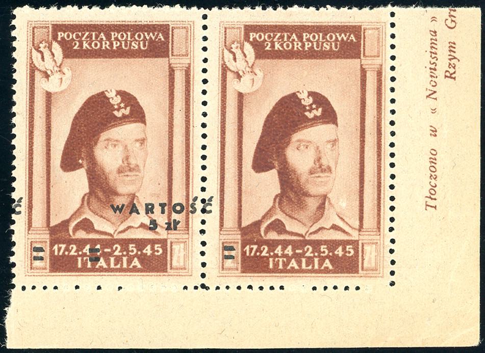 POSTA AEREA 1946 - 5 z. su 2 z. bruno rosso, coppia orizzontale, un esemplare con soprastampa fortemente spostata a destra, l'altro con ... Leggi tutto