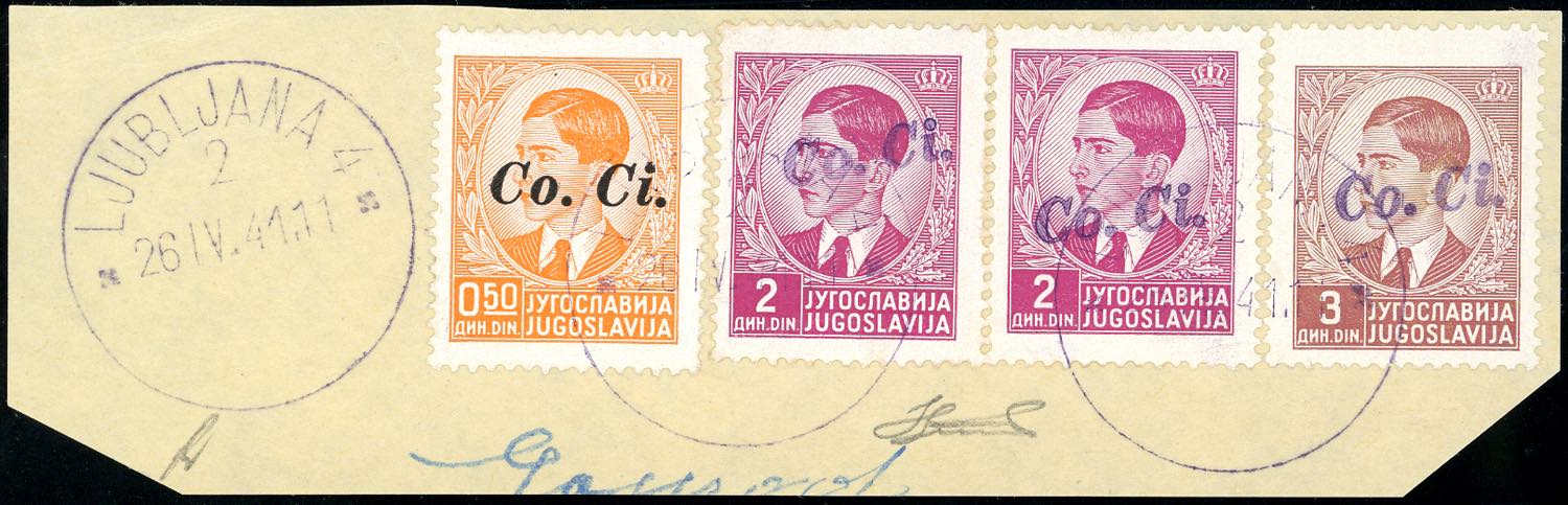 LUBIANA 1941 - 2 d., coppia, 3 d. soprastampa a mano "Co.Ci" obliqua in violetto, 50 p. soprastampa a macchina (5Bb,6Bb,2), perfetti, usati su frammento a Lubiana 26/4/1941, primo giorno d'emissione. Ferrario.
