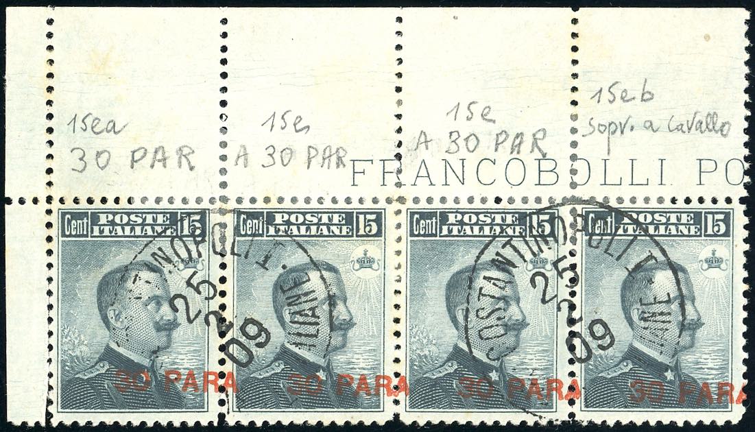 COSTANTINOPOLI 1908 - 30 pa. su 15 cent., III emissione locale, striscia orizzontale di quattro con la varietà 15ea, 15e, due esemplari, 15eb, angolo di foglio, usata, perfetta.