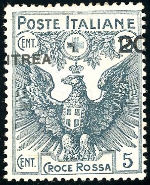 1916 - 20 su 15 + 5 cent. Croce Rossa, solo "ITREA" in soprastampa, dovuto a forte spostamento prima fila del foglio (43), nuovo, gomma ... Leggi tutto