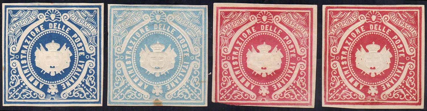 1864 - Stemma, saggi Giuseppe Re, mm. 42 x 42, quattro esemplari in colori differenti, gomma originale, buono stato.