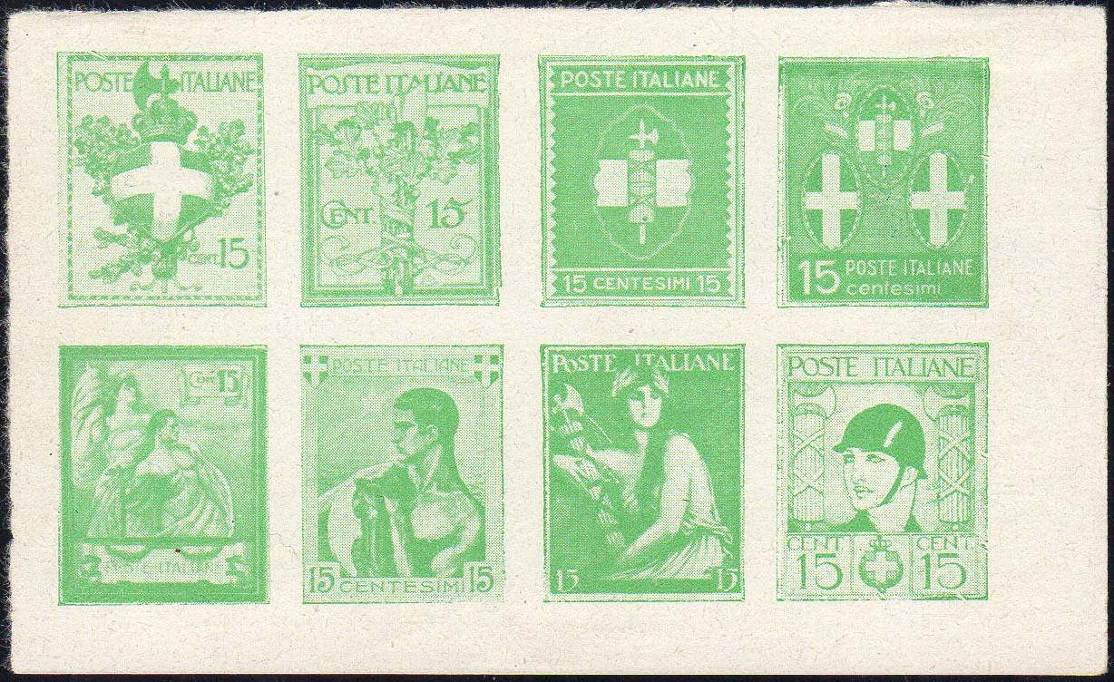 1922 - 15 cent. Saggi Arduini, propaganda al fascio, blocco foglietto degli otto tipi in verde giallo, su carta patinata, non dentellato (Unif. 103/110), senza gomma come sempre, perfetto. Raro e di ottima qualità. Ferrario.