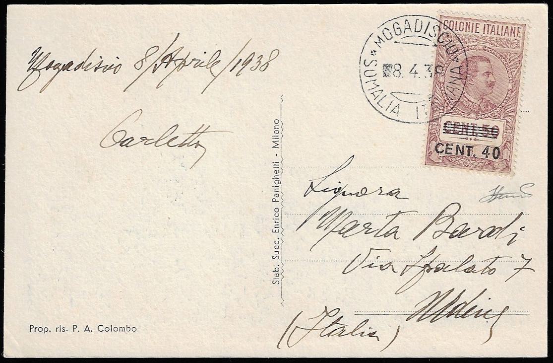 1938 - 40 cent. su 50 cent. marca da bollo, perfetta, su cartolina da Mogadiscio 8/4/1938 per Udine. Raro uso della marca fiscale per posta. Ferrario.