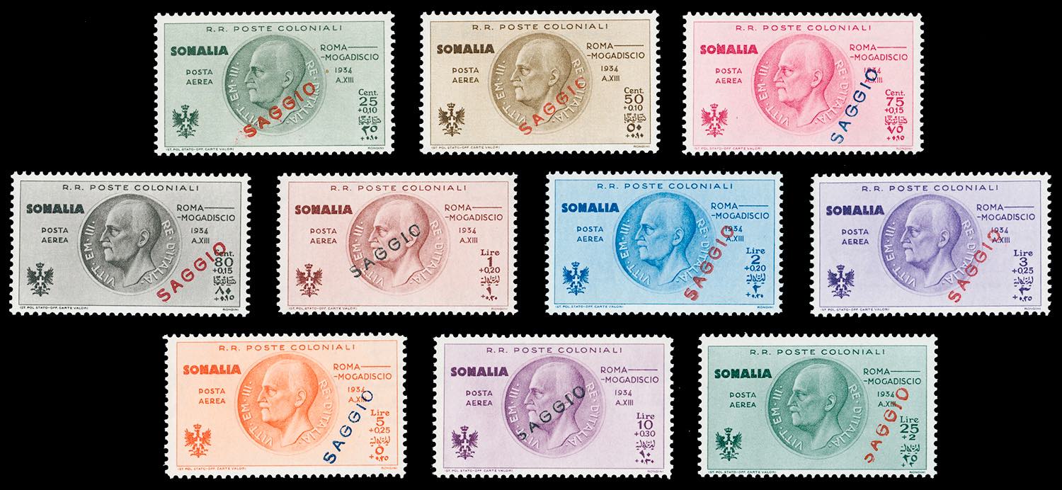 POSTA AEREA 1934 - Volo Roma - Mogadiscio, serie completa soprastampati "SAGGIO" (A7/A16), nuovi, gomma originale integra, perfetti. ... Leggi tutto