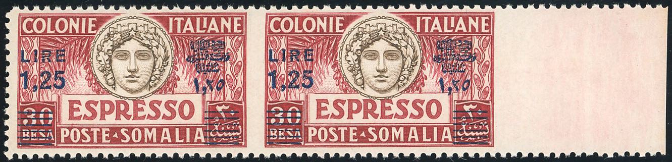 ESPRESSI 1927 - 1,25 lire su 30 b., dent. 11, coppia orizzontale non dentellata al centro e a destra (7e), bordo di foglio, gomma integra, ... Leggi tutto
