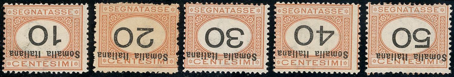 SEGNATASSE 1926 - Cifre nere, moneta italiana, cinque valori con soprastampa capovolta (42a/46a), gomma originale integra per i n. 43a e 45a, perfetti. Cert. Raybaudi per i n. 43a e 45a.