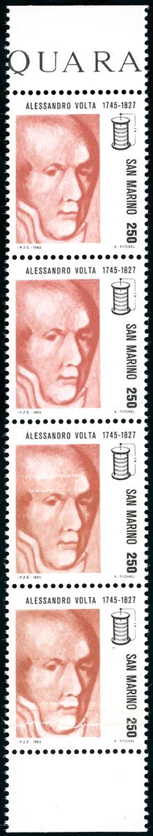 1983 - 250 lire Scienza - Volta, striscia verticale di quattro, due esemplari stampati su carta ricongiunta (1113a), gomma integra, ... Leggi tutto
