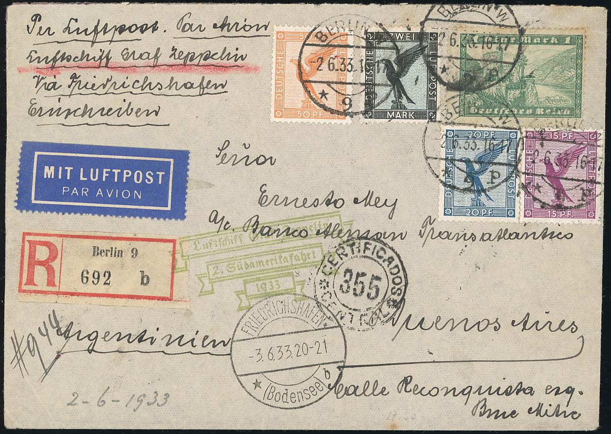 GERMANIA REICH POSTA AEREA ZEPPELIN 1933 - Aerogramma raccomandato da Berlino 2/6/1933 a Buenos Aires, bolli d'arrivo, con cachet speciale del 2°Sudamerikafahrt 1933, francobolli perfetti.