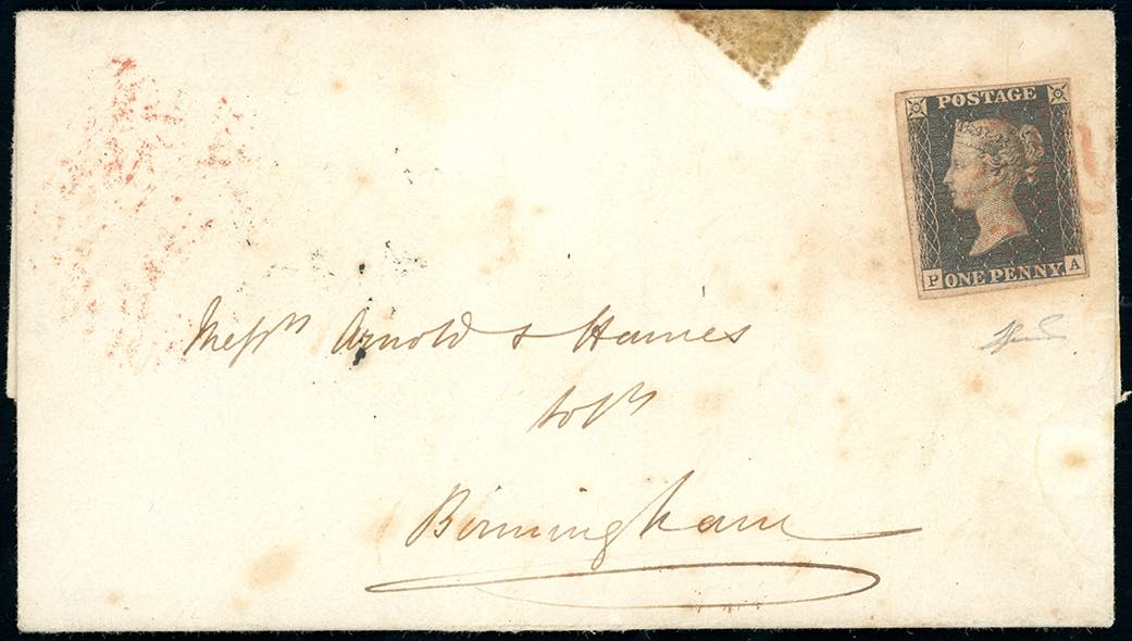 GRAN BRETAGNA 1940 - 1 p. Penny Black, P-A (1), ossidazioni su lettera da Londra 28/7/1840 per Birmingham. Ferrario.